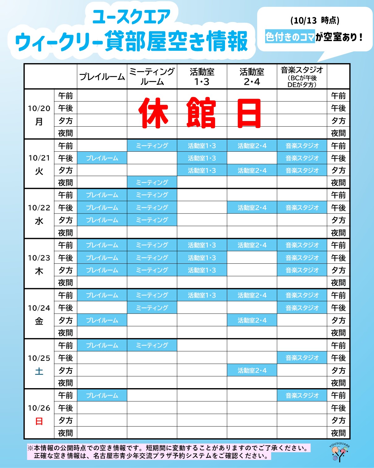 📢ユースクエアのウィークリー貸部屋空き情報(10/13時点)