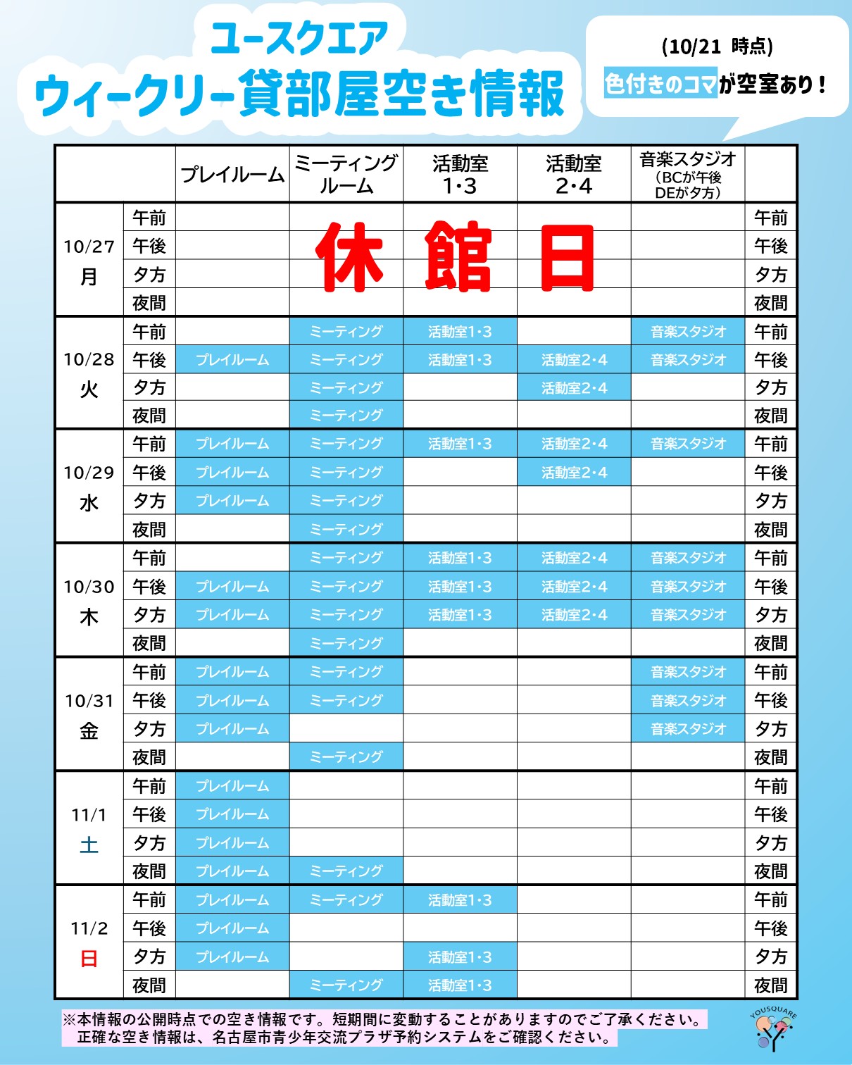 📢ユースクエアのウィークリー貸部屋空き情報(10/21時点)