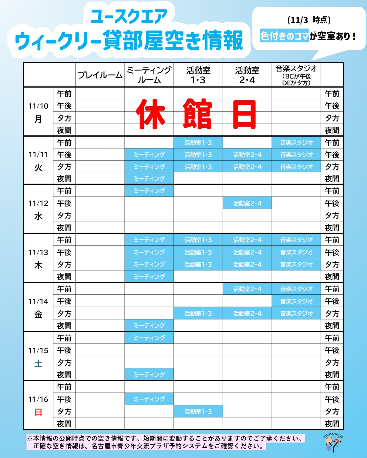📢ユースクエアのウィークリー貸部屋空き情報(11/3時点)