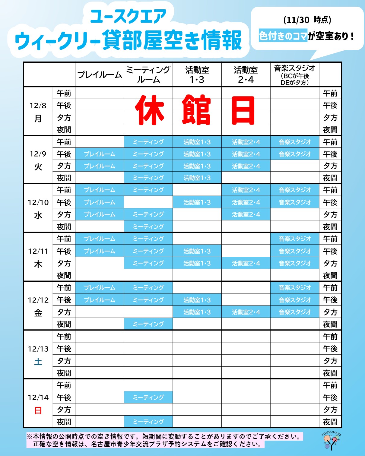 📢ユースクエアのウィークリー貸部屋空き情報(11/30時点)