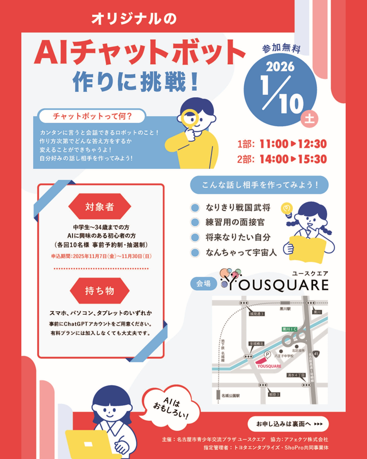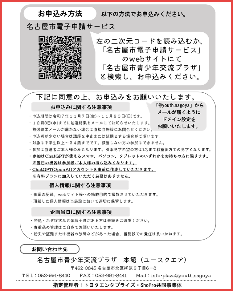 申込みは「名古屋市電子申請サービス」にて「名古屋市青少年交流プラザ」と検索し、お申込みください。