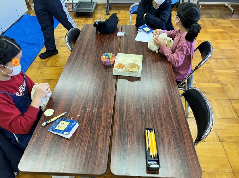 布を輪ゴムで縛ったり、折ったりしながら模様をつくっていく工程では、紙に完成後のイメージを描いて、イメージ通りに作ろうを努力する姿も見られました。👓👀