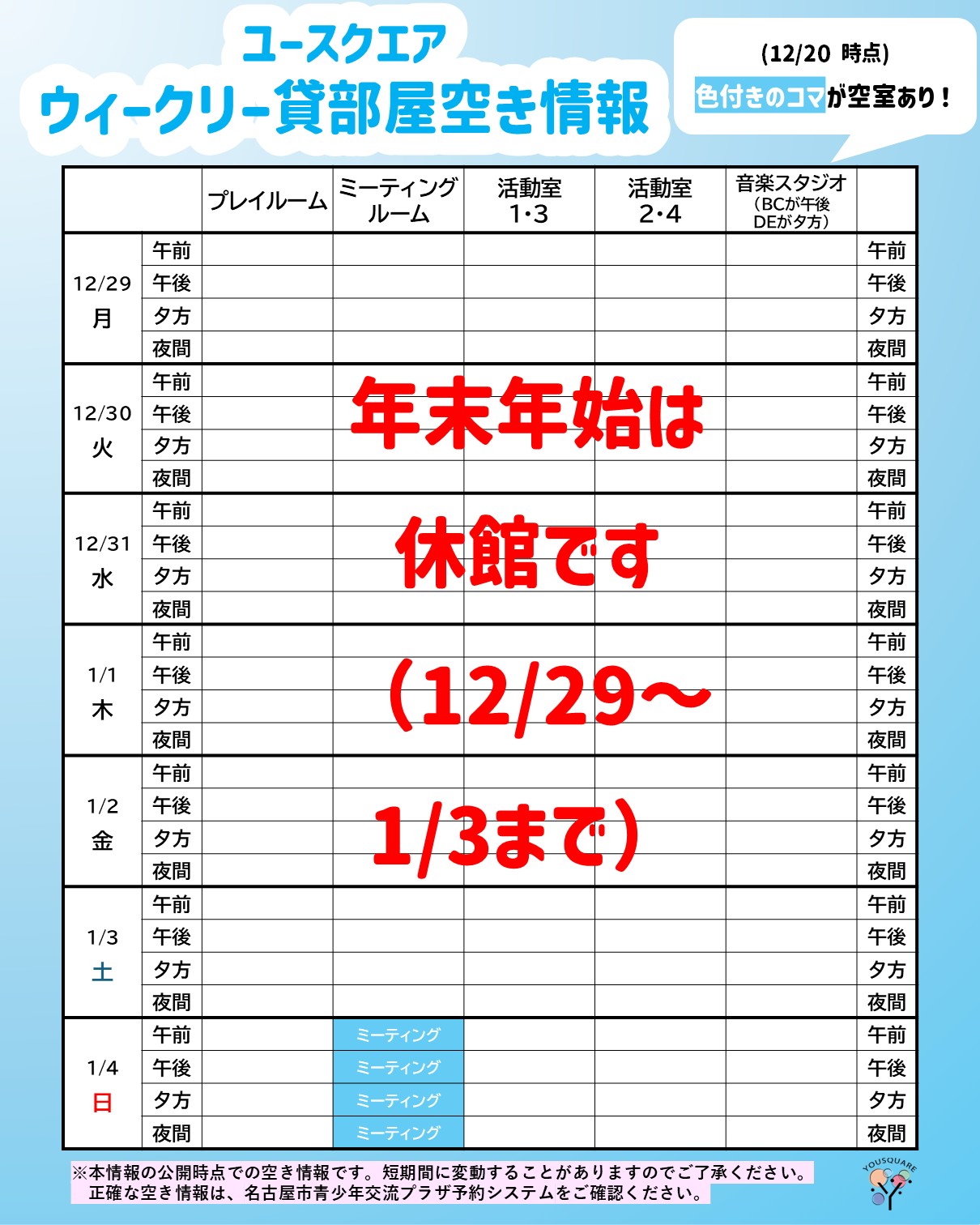 ・年末年始(12月29日から翌年1月3日)