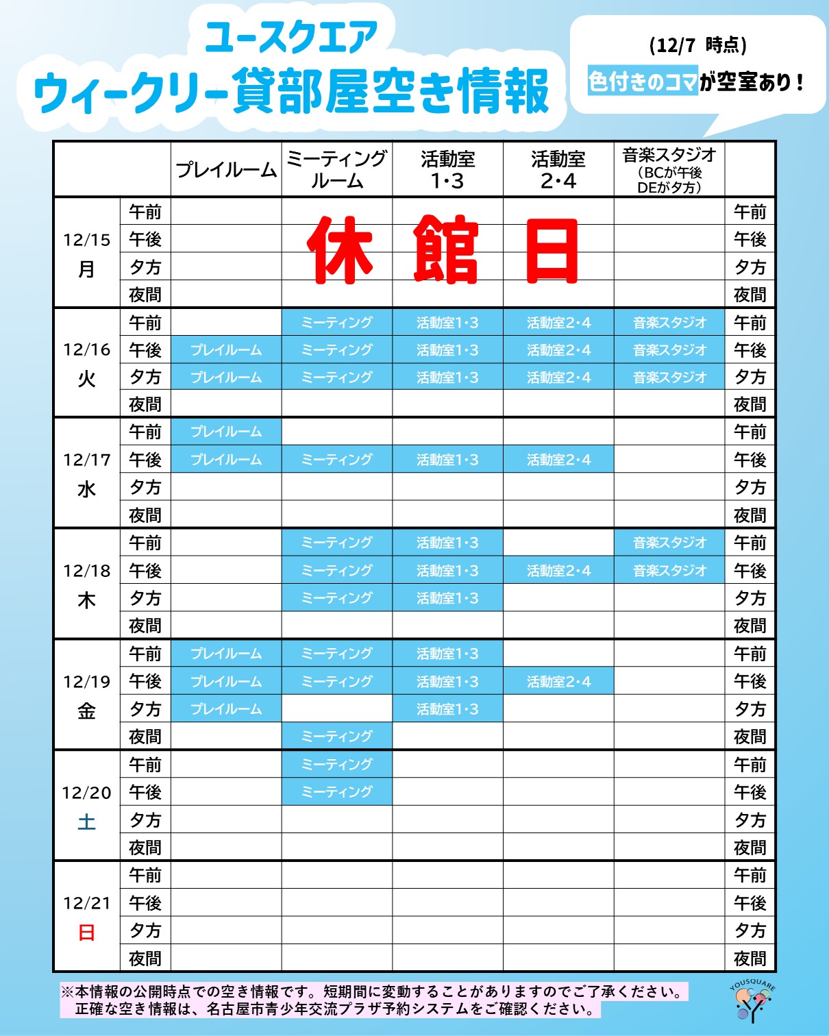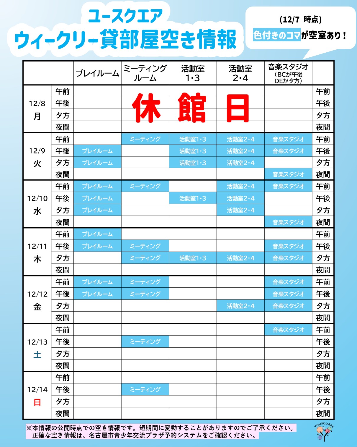 📢貸部屋空き情報&自習室スケジュール【ユースクエア】(12/7時点)